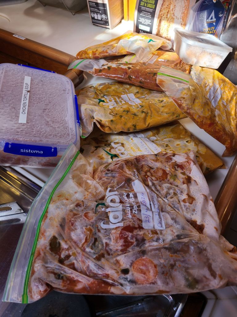 Week 2 is almost done. I’ve worked out that the toughest job on the ship belongs to the chef. I’ve been trying to make at least two meals a day that go into the freezer for passage making. When seasickness strikes (and it will), I want to be able to throw something in a pot and have a hot meal ready to go with pasta, potatoes, or rice.